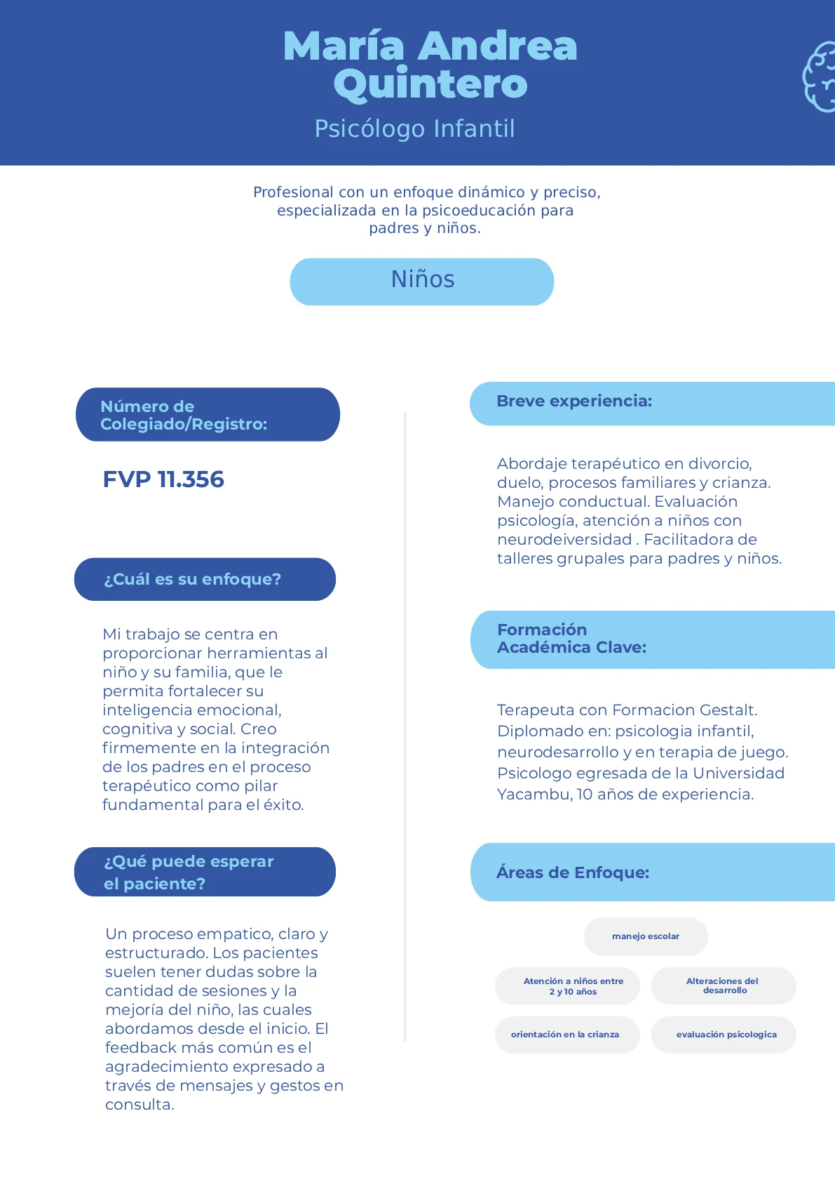He dedicado mis 10 años de carrera exclusivamente a la psicología clínica infantil y la atención temprana (0 a 10 años). Mi experiencia no se limita al consultorio: inicié mi trayectoria en las aulas como tutoría escolar (maestra sombra), lo que me otorgó una comprensión profunda de la realidad educativa. He intervenido exitosamente en casos complejos de ansiedad, trauma y duelo, respaldando mi práctica con dos Maestrías internacionales para manejar con experticia retos cotidianos como las rabietas y la falta de autorregulación.