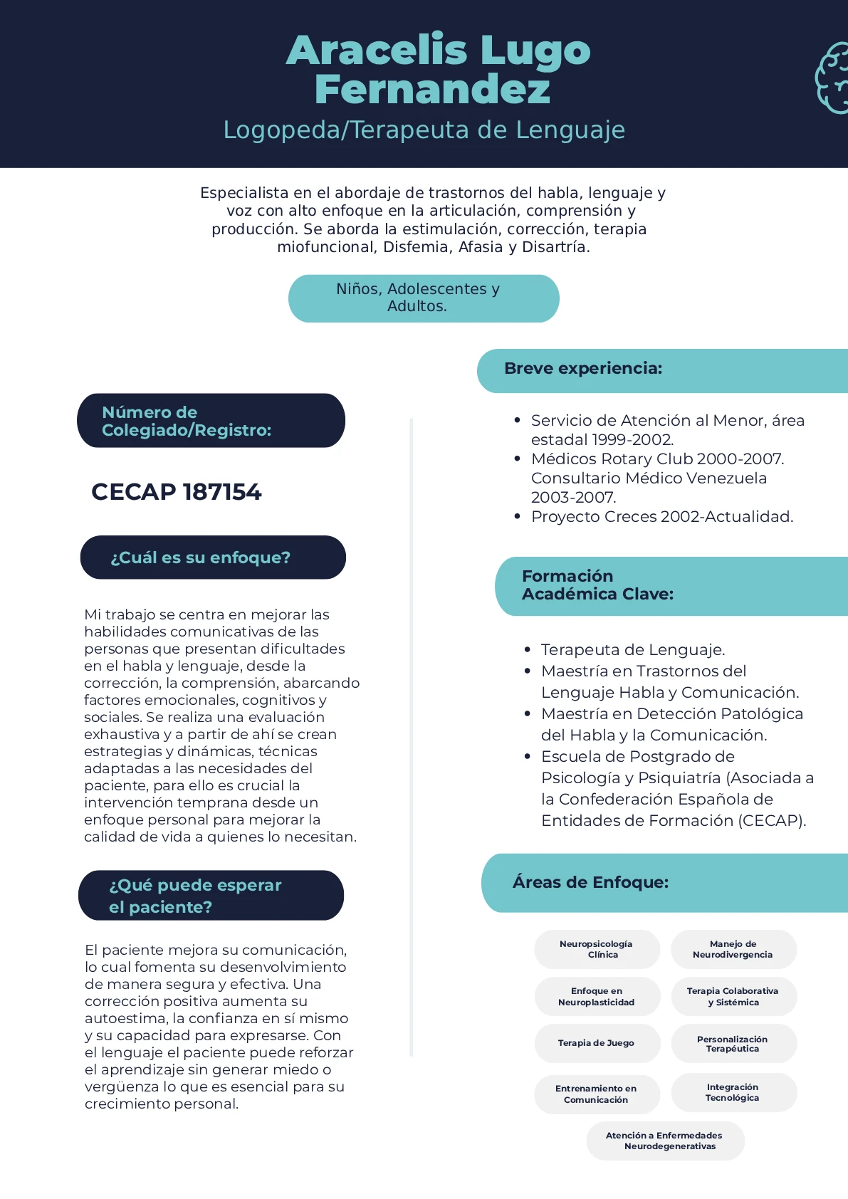 Durante mis 25 años de ejercicio profesional, he consolidado una vasta experiencia clínica que inició en el sector público y el Rotary Club, y que se ha afianzado ininterrumpidamente desde 2002 en Proyecto Creces. He dedicado mi carrera a rehabilitar la comunicación en todo el ciclo vital: he intervenido desde la estimulación temprana en niños con Neurodivergencia (TEA, Síndrome de Down) hasta la recuperación funcional en adultos con Afasia y enfermedades neurodegenerativas. Respaldada por dos Maestrías internacionales, he implementado con éxito modelos de neuroplasticidad y terapia miofuncional para corregir trastornos complejos de habla y voz, devolviendo a mis pacientes la seguridad para expresarse.