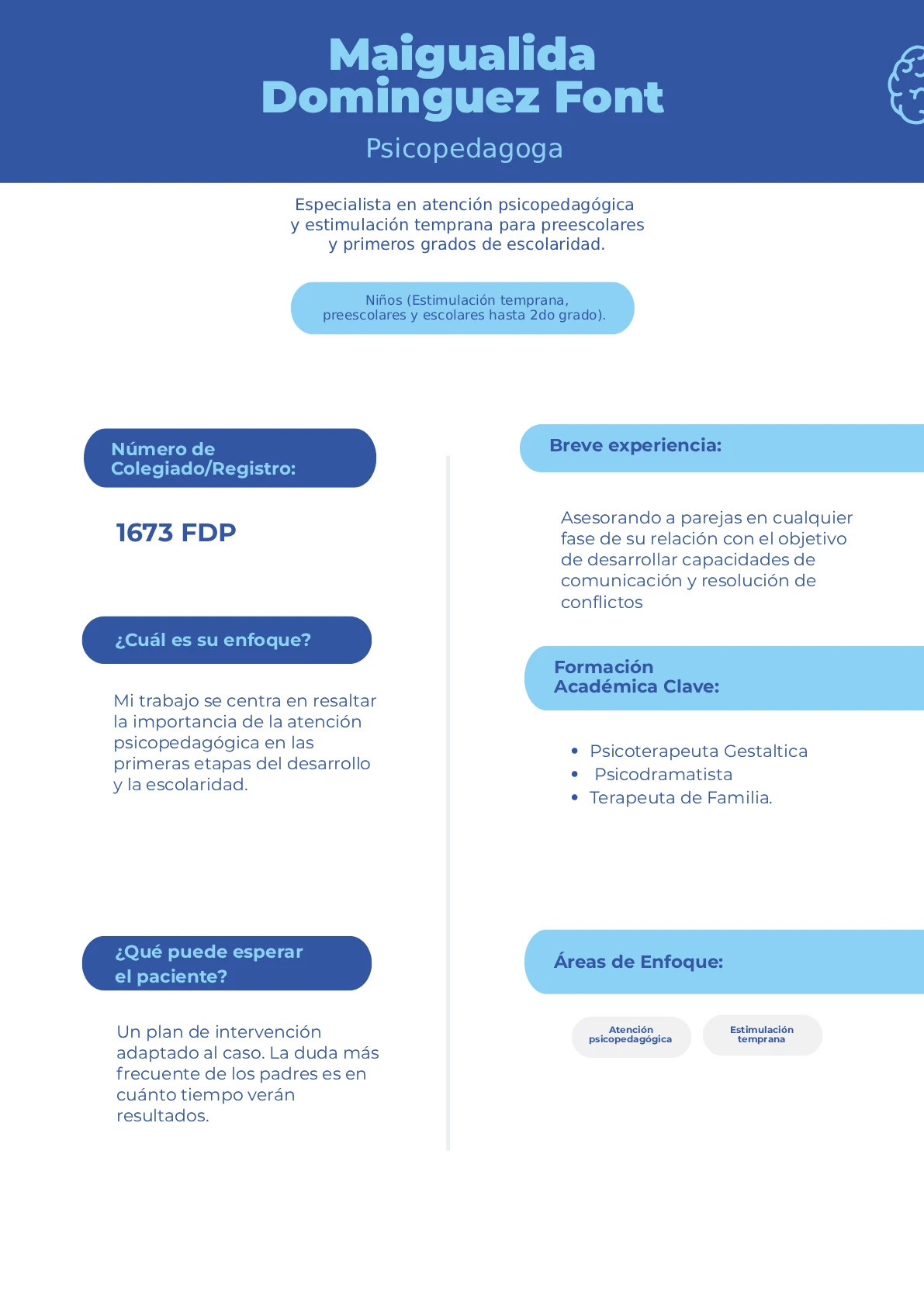 Psicopedagoga especializada en atención educativa y estimulación temprana, enfocada en niños desde la etapa preescolar hasta el segundo grado. Mi trabajo se centra en resaltar la importancia vital de la intervención psicopedagógica durante los primeros años del desarrollo y la escolaridad. En mi consulta, ofrezco un plan de intervención totalmente adaptado a las necesidades de cada caso; entiendo que la duda más frecuente de los padres es saber en cuánto tiempo verán resultados, por lo que me dedico a construir bases sólidas para el avance de sus hijos.